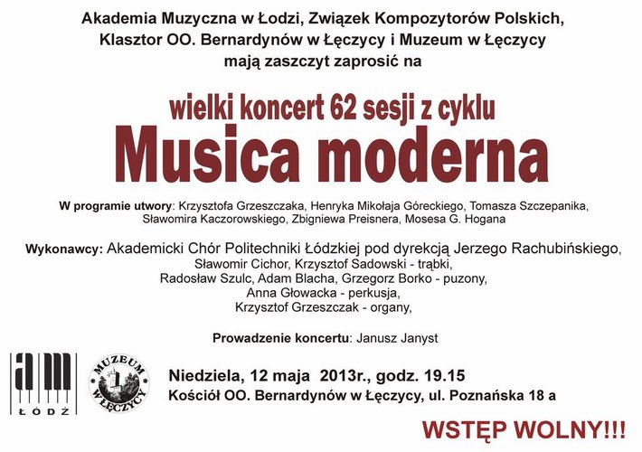 Katedra Kompozycji Akademii Muzycznej w Łodzi, Muzeum w Łęczycy i Klasztor Ojców Bernardynów w Łęczycy serdecznie zapraszają do kościoła Bernardynów w Łęczycy na tradycyjny wiosenny Wielki Koncert z cyklu „Musica Moderna”, który odbędzie się 18 maja w niedzielę po wieczornej Mszy Świętej (ok. godz. 19.15).