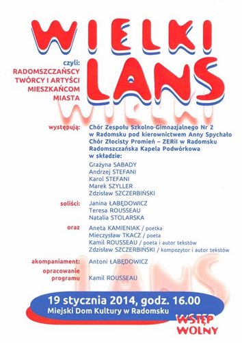 Wielki lans, to program muzyczno-poetycki przygotowany przez radomszczańskich twórców i artystów. Na scenie Miejskiego Domu Kultury w Radomsku 19 stycznia o godz. 16.00 wystąpią: