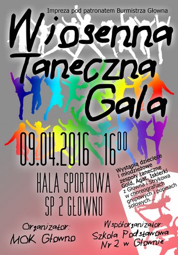 Miejski Ośrodek Kultury w Głownie zaprasza na Wiosenną Taneczną Galę 2016, która odbędzie się 9 kwietnia od godz. 16.00 w Hali Widowiskowo - Sportowej w Głownie. Wystąpią dziecięce i młodzieżowe zespoły taneczne: Gold, Agat i Iskierki w układach zarówno grupowych jak i solowych.
