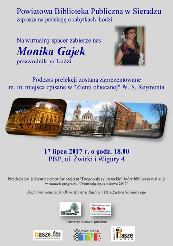 Powiatowa Biblioteka Publiczna w Sieradzu zaprasza na prelekcję o zabytkach Łodzi. Na wirtualny spacer zabierze nas Monika Gajek, przewodnik po Łodzi: 17 lipca 2017 r. o godz. 18.00, PBP, ul. Żwirki i Wigury 4.