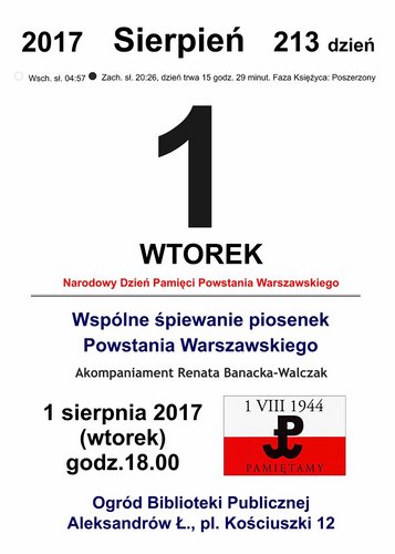 1 sierpnia o godz. 18.00 w ogrodzie Biblioteki Publicznej im. Jana Machulskiego w Aleksandrowie Łódzkim odbędzie sie wspólne śpiewanie piosenek Powstania Warszawskiego. Spotkanie poprowadzi Renata Banacka-Walczak, która będzie również akompaniowała śpiewającym.