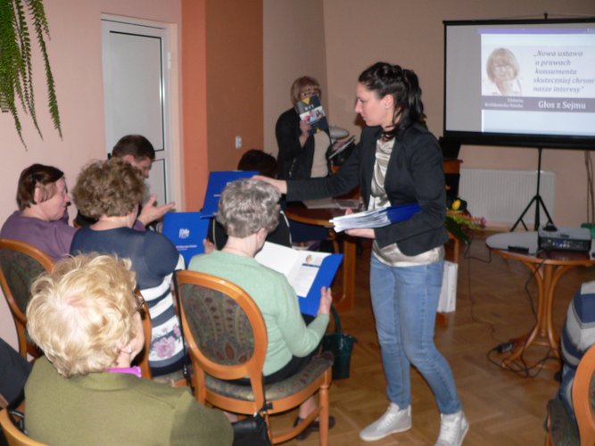Chyba każdy z nas zawiódł się na jakimś zakupie. Wciąż słyszymy o rosnącej liczbie nieuczciwych praktyk sprzedaży. Dobrze wiedzieć jakie mamy prawa, aby nie dać się nikomu wykorzystać. Nowelizacja ustawy o prawach konsumenta jasno określa, że sprzedający bierze na siebie odpowiedzialność za jakość produktu i ma obowiązek rzetelnego informowania klienta o całkowitych kosztach zakupu towaru i kosztach przesyłki. Obecnie mamy 14 dni (dotychczas było to 10 dni) na zwrot zakupionego towaru. Przy tym nie musimy naszej decycji niczym uzasadniać. Składając reklamacje powinniśmy wiedzieć, że to sprzedawca musi udowodnić, że daną rzecz użytkowaliśmy niezgodnie z jej przeznaczeniem. Zmiany wprowadzono także w ustawie nazywanej potocznie „o odwróconym kredycie hipotecznym”. W chwili obecnej kredyty te mogą być udzielane wyłącznie przez banki będące pod nadzorem finansowym. Osoba podpisująca umowę wybiera okres kredytowania. Najważniejsze jednak jest to, że mieszkanie nadal jest własnością osoby, która podpisała umowę z bankiem. W okresie 12 miesięcy po śmierci właściciela mieszkania, jego spadkobiercy mogą spłacić kredyt i odzyskać nieruchomość. Wcześniej po śmierci właściciela mieszkanie przechodziło na rzecz banku. Są to tylko wybrane informacje przekazane przez panią poseł uczestnikom spotkania.