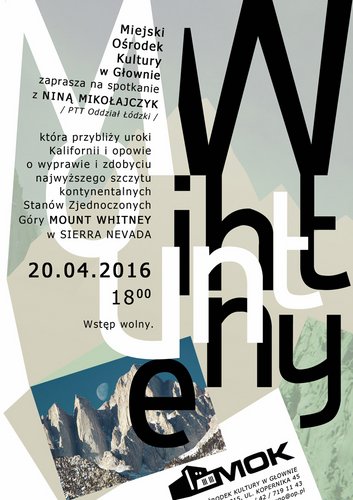 20 kwietnia w Miejskim Ośrodku Kultury w Głownie o Kalifornii i wyprawie na Mount Whitney w Sierra Nevada opowie Nina Mikołajczyk z Polskiego Towarzystwa Tatrzańskiego (Oddział w Łodzi). Spotkanie rozpocznie się o godz. 18.00. Wstęp wolny!