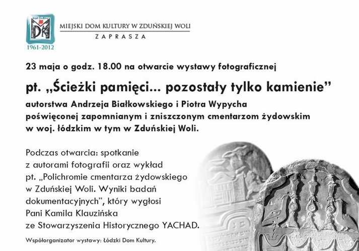 Bedzie to wystawa autorstwa Andrzeja Białkowskiego i Piotra Wypycha poświęcona zapomnianym i zniszczonym cmentarzom żydowskim w woj. łódzkim w tym w Zduńskiej Woli. Podczas otwarcia odbędzie się spotkanie z autorami fotografii oraz wykład pt. "Polichromie cmentarza żydowskiego w Zduńskiej Woli. Wyniki badań dokumentacyjnych", który wygłosi Pani Kamila Klauzińska ze Stowarzyszenia Historycznego YACHAD. Współorganizatorem wystawy jest Łódzki Dom Kultury.