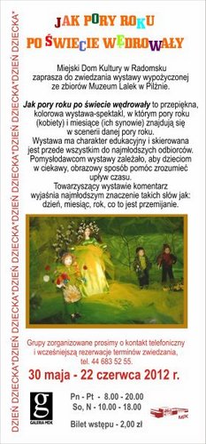 Miejski Dom Kultury w Radomsku zaprasza do zwiedzania wystawy wypożyczonej ze zbiorów Muzeum Lalek w Pilźnie. Ekspozycja dostępna będzie od 30 maja do 22 czerwca pod hasłem "Jak pory roku po świecie wędrowały". Jest to kolorowa wystawa-spektakl, w którym pory roku (kobiety) i miesiące (ich synowie) znajdują się w scenerii danej pory roku.