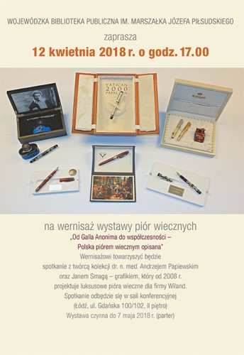 Niezwykła okazja dla miłośników sztuki pisania! 12 kwietnia o godz. 17.00 w WBP w Łodzi odbędzie się wernisaż wystawy „Od Galla Anonima do współczesności – Polska piórem wiecznym opisana”. Wydarzeniu towarzyszyć będzie spotkanie z twórcą kolekcji dr. n. med. Andrzejem Papiewskim oraz Janem Smagą – grafikiem, który od 2008 r. projektuje luksusowe pióra wieczne dla firmy Wiland.