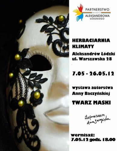 7 maja ( w poniedziałek) o godz.18.00 w Herbaciarni Klimaty w Aleksandrowie Łódzkim (ul.Warszawska 28) zostanie otwarta wystawa masek Anny Baczyńskiej pt.: "Twarz maski"