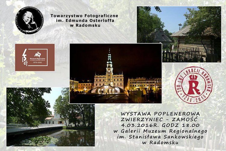 Muzeum Regionalne im. Stanisława Sankowskiego w Radomsku oraz Towarzystwo Fotograficzne im. Edmunda Osterloffa w Radomsku zapraszają na wystawę poplenerową „ZWIERZYNIEC – ZAMOŚĆ 2015”. Otwarcie wystawy w dniu 4 marca 2016 r. (piątek), godz. 18.00, Galeria Muzeum Regionalnego w Radomsku, ul. Narutowicza 1.