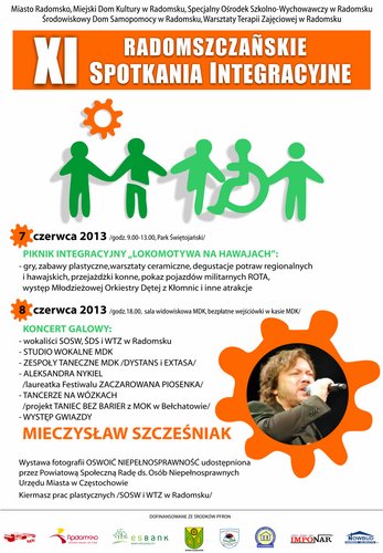 Miasto Radomsko, Miejski Dom Kultury w Radomsku, Specjalny Ośrodek Szkolno-Wychowawczy w Radomsku, Środowiskowy Dom Samopomocy w Radomsku, Warsztaty Terapii Zajęciowej w Radomsku zapraszają 7-8 czerwca na XI Radomszczańskie Spotkania Integracyjne.