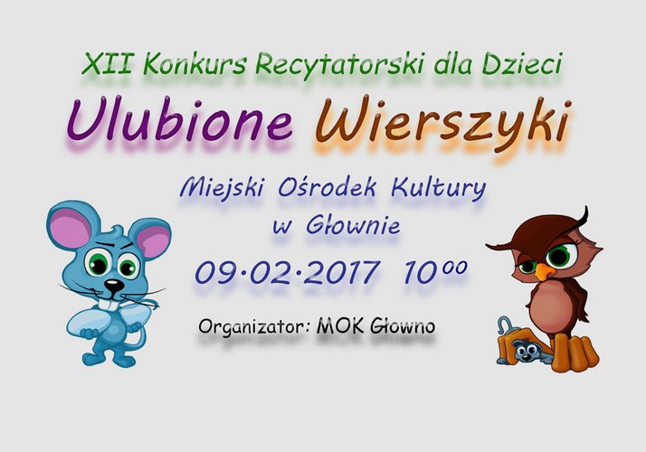 9 lutego o godz. 10.00 w Miejskim Ośrodku Kultury w Głownie odbędzie się finał XII edycji Konkursu Recytatorskiego dla dzieci ULUBIONE WIERSZYKI. Konkurs ten adresowany jest do przedszkolaków z publicznych i niepublicznych placówek przedszkolnych i szkolnych, z terenu miasta Głowna i gminy Głowno.