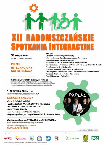 ORGANIZATORZY: Miejski Dom Kultury w Radomsku, Miasto Radomsko, Ośrodek Szkolno-Wychowawczy w Radomsku, Środowiskowy Dom Samopomocy w Radomsku, Towarzystwo Przyjaciół Dzieci, Stowarzyszenie Opiekunów i Rodziców Osób Niepełnosprawnych Koniczynka, Warsztaty Terapii Zajęciowej w Radomsku, Wspólnota BETEL, Fundacja PROMIEŃ RADOŚCI, Poradnia Psychologiczno-Pedagogiczna, Miejski Ośrodek Sportu i Rekreacji w Radomsku. SPONSORZY: ESBANK, GMINA KLESZCZÓW, PGK.