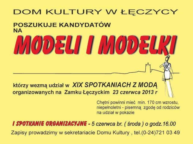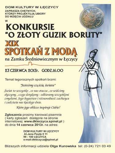 XIX SPOTKANIA Z MODĄ, organizowane przez Dom Kultury w Łęczycy na Zamku Królewskim 23 czerwca 2013, to jedna z najważniejszych i najbardziej prestiżowych imprez kulturalnych w naszym mieście. Co roku pokazy konkursowe, pozakonkursowe oraz atrakcje towarzyszące gromadzą wielu widzów, a także znane osoby ze świata projektantów mody. Ponownie ich niepowtarzalną scenerią będzie dziedziniec średniowiecznego Zamku Królewskiego w Łęczycy. W ramach Spotkań przeprowadzony zostanie konkurs dla nieprofesjonalnych projektantów mody, w którym walczyć będą o Złoty Guzik Boruty. Oprócz tego, jak co roku odbędzie się pokaz kolekcji profesjonalnej, wystawa i koncert muzyczny.