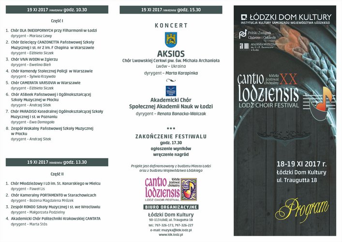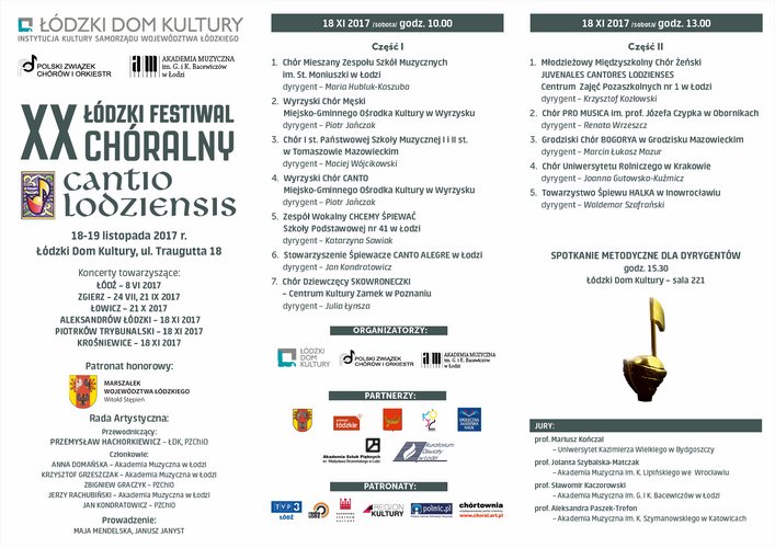 W dniach 18-19 listopada w Łodzi odbędzie się XX jubileuszowa edycja Łódzkiego Festiwalu Chóralnego CANTIO LODZIENSIS! Zachęcamy do zapoznania się z programem wydarzeń! Z okazji XX-lecia festiwalu została wydana płyta CD, na której znalazły się utwory łódzkich kompozytorów, nagrodzone chóry i zespoły wokalne oraz laureaci Grand Prix Łódzkich Festiwali Chóralnych Cantio Lodziensis z ubiegłych lat.