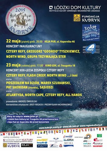 22 i 23 maja odbędą się XXXI Łódzkie Spotkania z Piosenką Żeglarską KUBRYK’ 2015. Na scenie wystąpi czołówka wykonawców sceny szantowej i folkowej: Cztery Refy, North Cape, Grupa Trzymająca Ster, Flash Creep, Sąsiedzi, Poszedłem Na Dziób, Atlantyda, All Hands oraz Pat Sheridan /Irlandia/.