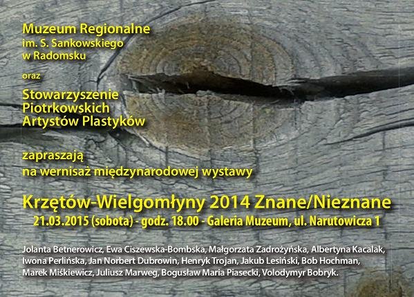 Muzeum Regionalne im. Stanisława Sankowskiego w Radomsku oraz Stowarzyszenie Piotrkowskich Artystów Plastyków serdecznie zapraszają na wernisaż międzynarodowej wystawy „KRZĘTÓW – WIELGOMŁYNY 2014 r. Z CYKLU ZNANE I NIEZNANE”, w dniu 21 marca 2015 r. (sobota), o godz. 18.00, Galeria Muzeum Regionalnego w Radomsku, ul. Narutowicza 1.