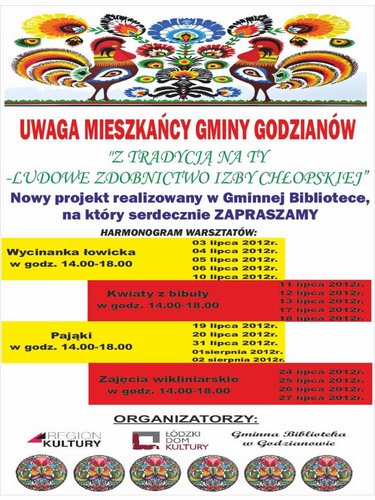 "Z tradycją na Ty - ludowe zdobnictwo izby chłopskiej" to projekt Gminnej Biblioteki Publicznej w Godzianowie, który został pozytywnie rozpatrzony przez Łódzki Dom Kultury i otrzymał dofinansowanie w konkursie pod nazwą:"Współorganizacja projektów kulturalnych na terenie województwa łódzkiego". Warsztaty potrwają do 2 sierpnia.