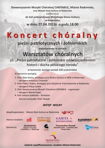 Polski Związek Emerytów Rencistów i Inwalidów oraz Miejski Dom Kultury w Radomsku zapraszają na „Zaczarowany wieczór, czyli Radomsko w wierszu i piosence”. Koncert połączony z recytacją wierszy odbędzie się 2 czerwca o godz. 16.00 z udziałem Anny Braszczyńskiej (poetki), Kamila Rousseau (poety i autora tekstów piosenek), Zdzisława Szczerbińskiego (kompozytora dyrygenta chóru, autora tekstów piosenek), Mieczysława Tkacza-poety, chórów – Złocisty Promień i Złota Nutka, duetu: Janina Łabędowicz i Teresa Rousseau i Radomszczańskiej Kapeli Podwórkowej.