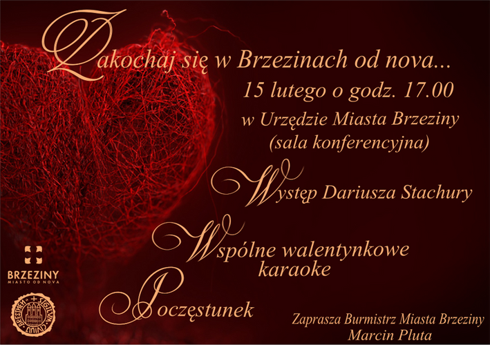 Burmistrz Miasta Brzeziny zaprasza na spotkanie walentynkowe - "Zakochaj się w Brzezinach od nova" - które odbędzie się 15 lutego w sali konferencyjnej Urzędu Miasta Brzeziny. Zapraszamy.