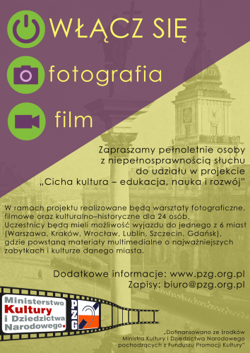 Zarząd Główny Polskiego Związku Głuchych w terminie od 1 maja 2019 r. do 31 grudnia 2020 r. realizuje projekt „Cicha kultura – edukacja, nauka i rozwój” w ramach Programu Edukacja Kulturalna. W ramach projektu realizowane będą warsztaty fotograficzne, filmowe oraz kulturalno–historyczne dla 24 osób. Uczestnicy będą mieli możliwość wyjazdu do jednego z 6 miast (Warszawa, Kraków, Wrocław, Lublin, Szczecin, Gdańsk), gdzie przy pomocy urządzeń fotograficznych i filmowych powstaną materiały multimedialne o najważniejszych zabytkach i kulturze danego miasta z tłumaczeniem na PJM.