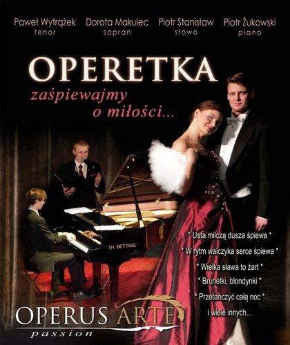 Podczas koncertu wystąpią utalentowani, charyzmatyczni soliści zespołu Operus Arte: Dorota Makulec (sopran) i Paweł Wytrążek (tenor), którzy na scenie sali widowiskowej zaprezentują m.in. utwory: „Usta milczą dusza śpiewa” „W rytm walczyka serce śpiewa” „Przetańczyć całą noc” „Brunetki, blondynki” „Wiedeńska Krew” „Żegnajcie przyjaciele” i wiele innych… Przy fortepianie znakomity pianista Piotr Żukowski a konferansjerkę poprowadzi Piotr Stanisław. * * * grupa artystycznaOperus Arte Grupa artystyczna Operus Arte swoją działalność koncertową rozpoczęła od września 2010 roku i od tego czasu wystąpiła już w ponad 80 miastach. Skład zespołu: Dorota Makulec – sopran, doktorantka Akademii Muzycznej w Łodzi Paweł Wytrążek – tenor, doktorant Akademii Muzycznej w Łodzi Piotr Żukowski – pianista, wykładowca Katedry Fortepianu Akademii Muzycznej Poznań Piotr Stanisław – konferansjer Serdecznie zapraszamy Dajcie się Państwo przenieść do roztańczonego i rozśpiewanego Wiednia….