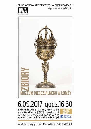 Biuro Wystaw Artystycznych w Skierniewicach w środę 6 września zaprasza na wykład z historii sztuki pt.: "Zbiory Muzeum Diecezjalnego w Łomży". O najmłodszej placówce gromadzącej sztukę sakralną w Polsce opowie Karolina Zalewska. Wykład rozpocznie się o godz. 16.30. Wstęp wolny!