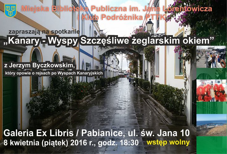 Miejska Biblioteka Publiczna im. Jana Lorentowicza w Pabianicach i Klub Podróżnika PTTK zapraszają wszystkich chętnych na rejs po egzotycznych Wyspach Kanaryjskich, który odbędzie się w Galerii Ex Libris w Pabianicach 8 kwietnia o godz. 18:30. Podczas spotkania pt. „Kanary – Wyspy Szczęśliwe żeglarskim okiem” o swoich przygodach opowie Jerzy Byczkowski. Wstęp wolny.