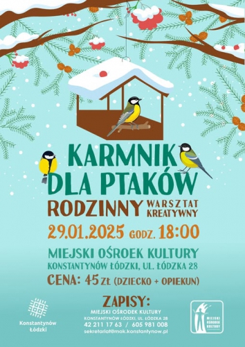 Miejski Ośrodek Kultury w Konstantynowie Łódzkim zaprasza na rodzinny warsztat kreatywny, podczas którego będzie można wykonać karmnik dla ptaków.
