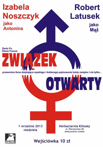 01.09.2013 (niedziela) godz.19.00 Herbaciarnia Klimaty spektakl Teatru Poczekalnia „Związek Otwarty” w wyk. Izabeli Noszczyk i Roberta Latuska; wejściówka 10 zł.