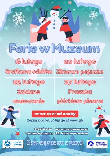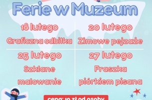 Muzeum może być miejscem do aktywnego spędzania czasu podczas ferii zimowych.Organizatorzy zapraszają osoby indywidualne oraz grupy zorganizowane do udziału w zajęciach: