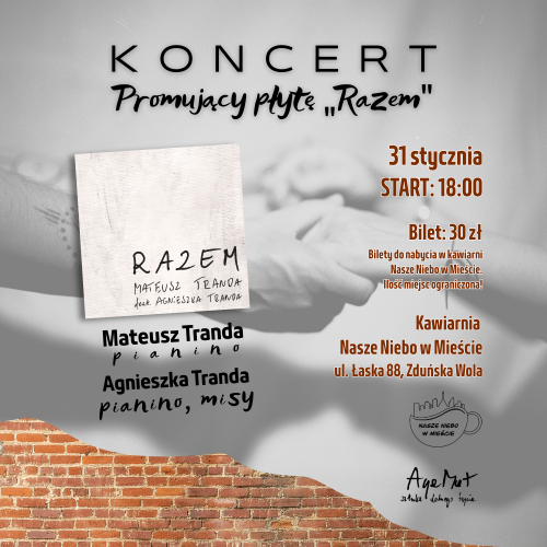 Koncert promujący płytę "Razem" to wyjątkowe wydarzenie muzyczne oparte na intymnym dialogu instrumentów i emocji, projekt Agnieszki i Mateusza celebruje autentyczność oraz relację z bliską osobą. Występując na scenie łączą klasyczne dźwięki pianina z brzmieniem mis. To wydarzenie dla osób szukających w muzyce czegoś więcej niż rozrywki - to zaproszenie do wspólnego oddechu i odnalezienia wewnętrznego spokoju w chaosie współczesnego świata.