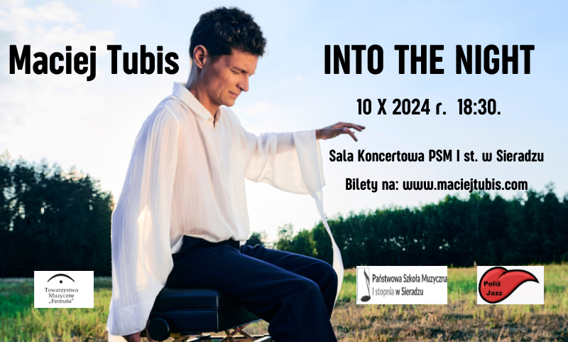 Artysta zabierze publiczność w intymną podróż, pełną szczerości i emocji, pozwalając na głębokie przeżycia i muzyczne odkrycia. Jego występy to wyjątkowa okazja, by poczuć bliskość z artystą i dzielić się emocjami poprzez dźwięki. Album „Into the Night” ukazał się zarówno na płycie CD, jak i winylu. Dla kolekcjonerów przygotowano limitowaną edycję – 300 egzemplarzy winylu, który świeci w ciemności. Ta unikatowa wersja będzie dostępna wyłącznie na koncertach. Nie przegap okazji, by być częścią tego wyjątkowego wydarzenia!Na koncert zapraszają: sieradzkie Towarzystwo Muzyczne FERMATA oraz Państwowa Szkoła Muzyczna I stopnia w Sieradzu.