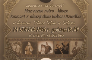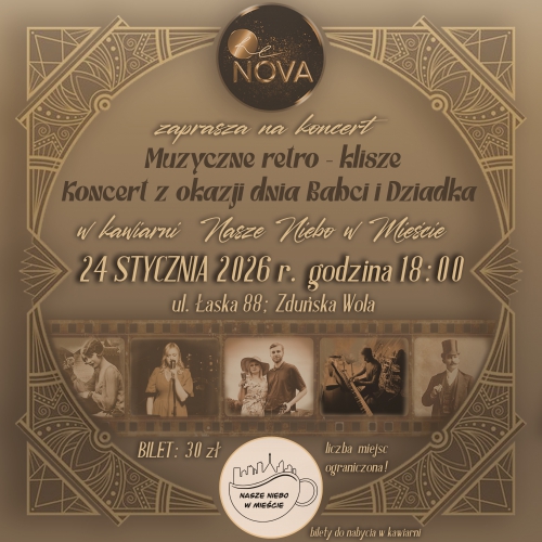 Zapraszamy na wyjątkowy koncert "Muzyczne retro – klisze". Koncert z okazji Dnia Babci i Dziadka odbędzie się w kawiarni Nasze Niebo w Mieście w Zduńskiej Woli.