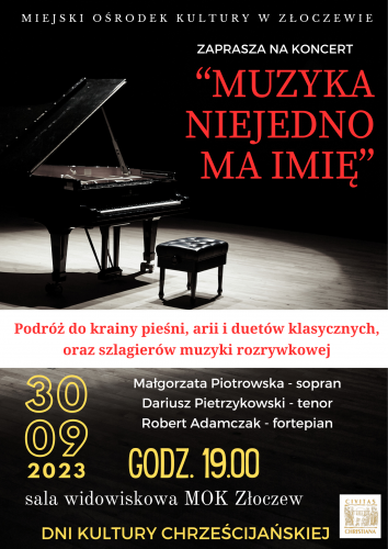 30 września w Złoczewie odbędzie się koncert "Muzyka niejedno ma imię". Będzie to podróż do krainy pieśni, arii i duetów klasycznych, oraz szlagierów muzyki rozrywkowej.