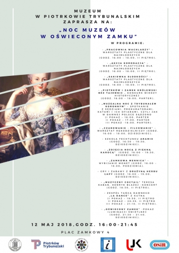 12 maja piotrkowskie Muzeum zaprasza wszystkich zwiedzających do „Oświeconego Zamku” w ramach corocznej akcji Noc Muzeów. Uczestnicy przeniosą się wtedy do XVIII wieku – epoki racjonalizmu, czasu rozumu i filozofów, nie stroniącej jednak od kunsztownej mody, pięknego otoczenia czy wykwintnego stołu.
