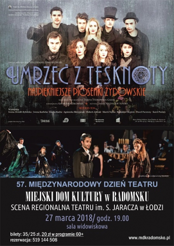 „Umrzeć z tęsknoty czyli najpiękniejsze piosenki żydowskie” Teatru im. S. Jaracza w Łodzi to muzyczno-teatralne widowisko, które odbędzie się 27 marca o godz. 19.00 w ramach Międzynarodowego Dnia Teatru. Dawny świat kultury żydowskiej zaklęty w piosenkach w wykonaniu młodych i utalentowanych aktorów.