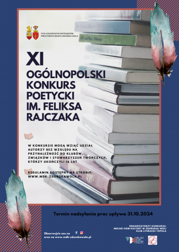 Zapraszamy do wzięcia udziału w 11. edycji Ogólnopolskiego Konkursu Poetyckiego im. Feliksa Rajczaka, który jest organizowany "Pod honorowym patronatem Prezydenta Miasta Zduńska Wola”.