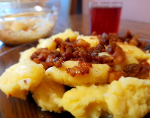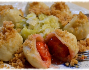 - ziemniaczane knedle z truskawkami i młodą kapustą
