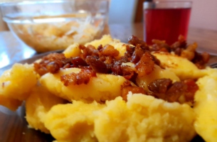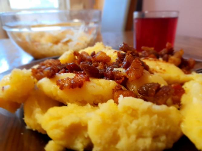 Odmianą są prażuchy żelazne: Do gotujących ziemniaków wraz z mąką dodaje się utarte surowe ziemniaki.