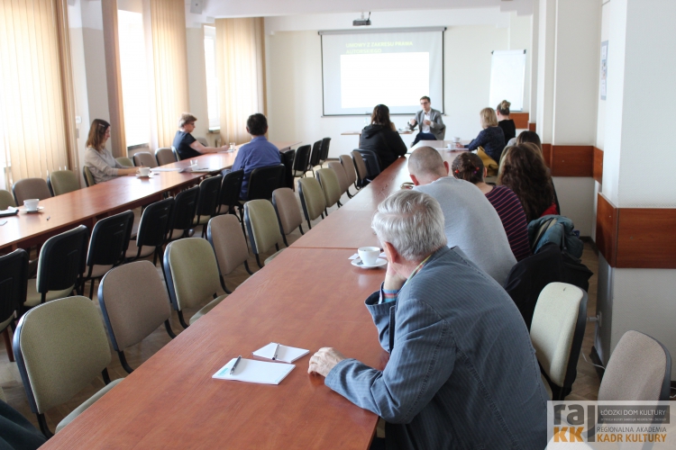 Piotr Łada, który poprowadził szkolenie przedstawił wszystkim uczestnikom rodzaje oraz charakterystykę umów cywilnoprawnych zawieranych w instytucjach kultury. Duży nacisk położony został na wskazanie różnic występujących między poszczególnymi typami umów oraz wskazanie przyczyn kwestionowania umów przez organy takie jak PIP, ZUS czy US. Trzon spotkania stanowiło przedstawienie i objaśnienie zagadnień z zakresu prawa autorskiego w umowach takich jak: podstawowe zasady zbywania praw autorskich, umowy licencyjne i ich rodzaje, pola eksploatacji, umowy a autorskie prawa osobiste, utwory pracownicze itp. Prowadzący omówił również możliwości wykorzystania „cudzej” twórczości oraz związane z tym obostrzenia oraz różne aspekty prawne działalności kulturalnej. Ostatnie godziny spotkania przeznaczone zostały na omówienie prawa do wizerunku oraz ochrona dóbr osobistych a także zagadnienia prawnoautorskie w sieci Internet.