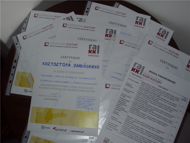 12 kwietnia 2013 r. odbyło się ostatnie szkolenie z bloku B z modułu "Finansowanie". Uczestnicy, którzy systematycznie brali udział w szkoleniach otrzymali certyfikaty.