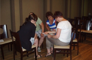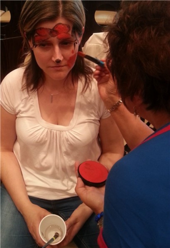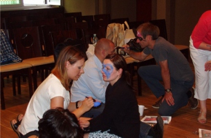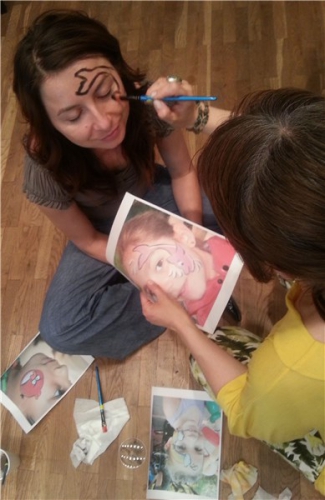 Szkolenie animacyjne było jednym z najweselszych, jakie widział Łódzki Dom Kultury! Gry i zabawy festynowe wciągnęły wszystkich bez reszty. Zaczęliśmy od scenek pantomimicznych, gier ruchowych typu "twister bez twistera", które wspaniale wszystkich zintegrowały, ale prawdziwym hitem było malowanie twarzy. Po zaprezentowaniu przez prowadzącą farb, opisaniu sposobów ich wykorzystania oraz kilku przykładowych wzorów, zaczęło się szaleństwo. Na kolejnych twarzach pojawiali się Spidermeni, Angry Birds, delfini, motywy kwiatowe, piraci i żabki. Po jakimś czasie zabrakło czystych twarzy i trzeba było przejść na przedramiona. Z prawdziwym smutkiem zmywaliśmy wspaniałe malunki pod koniec zajęć.